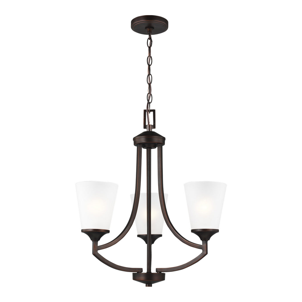 The Sea Gull Collection Hanford three light single tier chandelier in burnt sienna supplies ample lighting for your daily needs, while adding a layer of today`s style to your home`s decor. The transitional styling of the Hanford lighting collection by Sea Gull Collection is evident in its elegant symmetry articulated by long, sweeping arms. Tapered Etched glass shades produce a soft up light and make Hanford complementary to a wide array of decor from traditional to contemporary. Offered in both Brushed Nickel and Burnt Sienna finishes, the collection includes five-, nine- and fifteen-light chandeliers, a three-light hall/foyer light, a one-light mini pendant, a three-light pendant, a three-light semi-flush mount which can convert into a pendant, and one-, two-, three- and four-light bath fixtures. Incandescent and ENERGY STAR-qualified LED lamping are available, all fixtures are California Title 24 compliant.