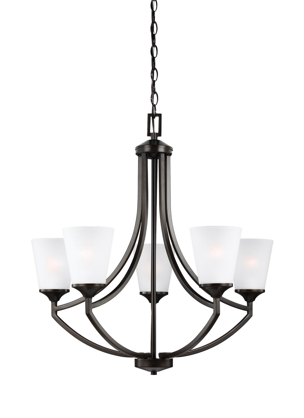 The Sea Gull Collection Hanford five light single tier chandelier in burnt sienna enhances the beauty of your home with ample light and style to match today`s trends. The transitional styling of the Hanford lighting collection by Sea Gull Collection is evident in its elegant symmetry articulated by long, sweeping arms. Tapered Etched glass shades produce a soft up light and make Hanford complementary to a wide array of decor from traditional to contemporary. Offered in both Brushed Nickel and Burnt Sienna finishes, the collection includes five-, nine- and fifteen-light chandeliers, a three-light hall/foyer light, a one-light mini pendant, a three-light pendant, a three-light semi-flush mount which can convert into a pendant, and one-, two-, three- and four-light bath fixtures. Incandescent and ENERGY STAR-qualified LED lamping are available, all fixtures are California Title 24 compliant.
