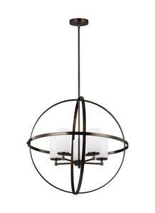 The Sea Gull Collection Alturas five-light single tier contemporary chandelier in the brushed oil rubbed bronze finish is the perfect way to achieve your desired glow. This eye catching piece features five lights gathered around a center post with two circular galvanized metal accents. The silhouette is made of an interlocking, spherical steel frame, which draws the eye to the light emitted from the cylindrical Satin Etched glass shade. If you are starting to convert to a more sustainable lifestyle, this ENERGY STAR® qualified lighting fixture uses LED bulbs to save you both time and money. The Sea Gull Collection by Generation Lighting has been an industry leader since 1919. Sea Gull`s promise is simple – to create beautiful lighting at an affordable value. From space, to function, to style and energy efficiency, Sea Gull offers complete solutions.