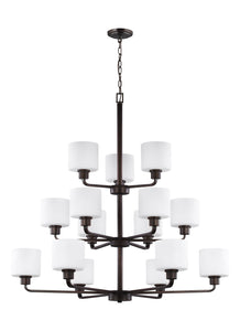 The Sea Gull Collection Canfield fifteen light multi tier chandelier in burnt sienna provides abundant light to your home, while adding style and interest. Behind every seemingly simple design lies unerring attention to restraint and obsessive attention to the tiniest details. The Canfield collection by Sea Gull Collection draws on the modernist traditions of ``less is more``. Essential functional elements dictate the aesthetics, and clean lines prevail. Layers of intricately finished hand-brushed steel progress vertically to the soft glow of light diffused through finely Etched glass diffusors. Canfield offers a ``whole home`` lighting solution, offering lighting in every imaginable category from the auspicious 15 light 3-tier chandelier, to the concise mini-pendant and one-light sconces. The collection is available in hand brushed Burnt Sienna for a warm, tactile, almost Craftsman design style, or a brushed nickel to emphasize the more architectural elements of your interior.