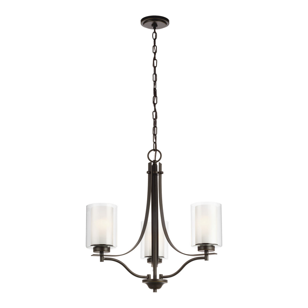 The Manufacturer Collection three light single tier chandelier in heirloom bronze is the perfect way to achieve your desired fashion or functional needs in your home. Collection by Sea Gull Collection has clear glass tube shades with an inner white glass element that softens the light and helps cast an even glow. A cylinder of etched glass is centered within a larger cylinder of clear glass which encircles each light bulb to create this stunning visual effect. The full assortment includes three-, five-and nine-light chandeliers, a four-light linear, one-light mini pendant, a three-light pendant, a two-light semi flush which is convertible into a pendant, and one-, two-, three- and four-light bath fixtures. All fixtures offered in either a Brushed Nickel or Brushed Oil Rubbed Bronze. Incandescent and ENERGY STAR-qualified LED lamping are available, all fixtures are California Title 24 compliant.