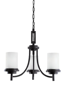 The Manufacturer Collection three light single tier chandelier in blacksmith is an ENERGY STAR� qualified lighting fixture that uses fluorescent bulbs to save you both time and money. The Collection indoor lighting collection by Manufacturer has a clean design which lends itself to a modern-mission style. The geometric, cylinder design has subtle ornamentation, while still offering impressive style. The indoor lighting collection is offered in Brushed Nickel or textured Blacksmith finishes, both with Satin Etched glass. The assortment includes 15-light, nine-light, five-light, and three-light chandeliers, pendants in four sizes, both flush and semi-flush ceiling fixtures, as well as one-light, two-light, three-light and four-light wall/bath fixtures. Most of these fixtures easily convert to LED by purchasing LED replacement lamps sold separately.