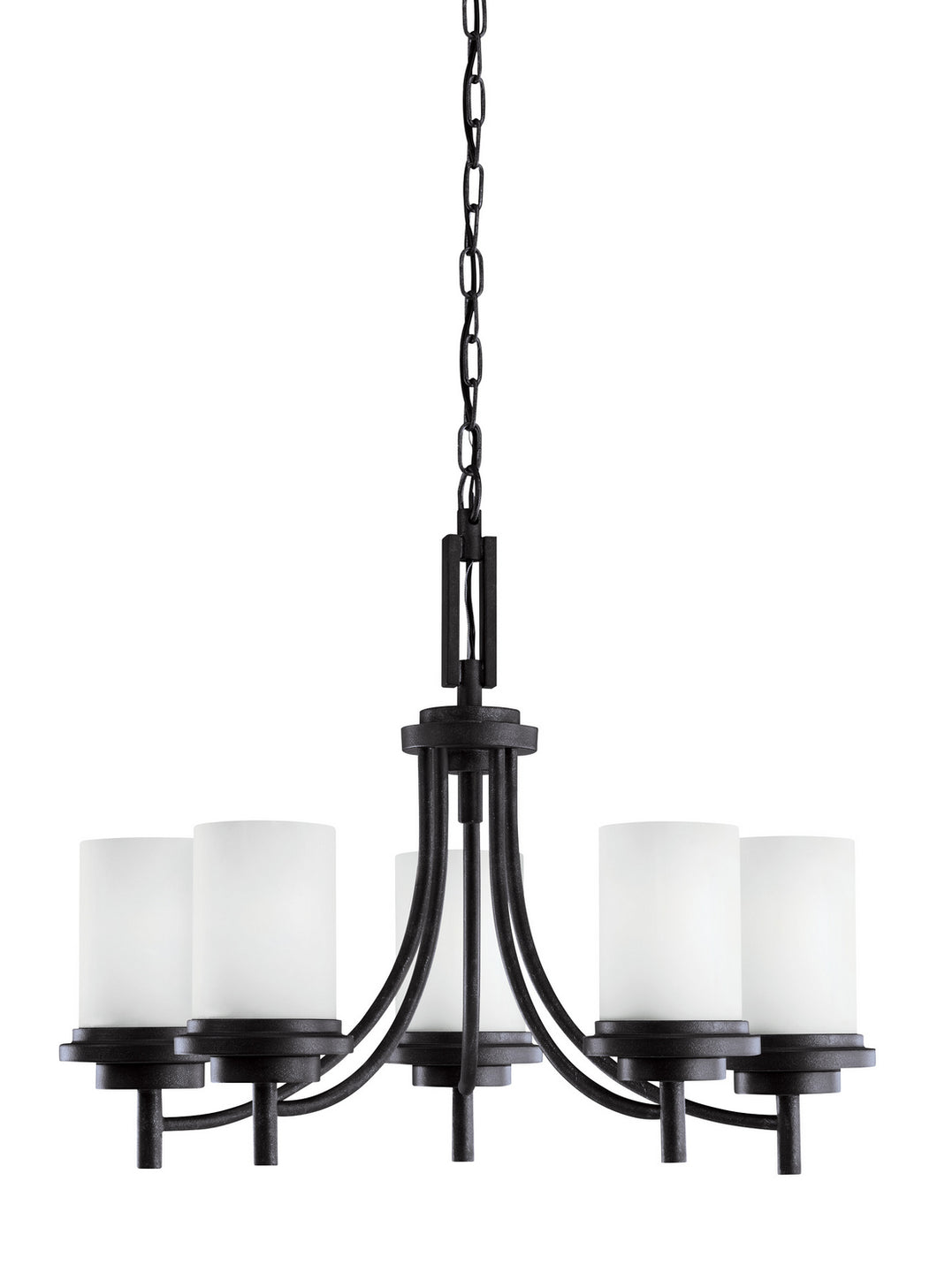 The Sea Gull Collection Winnetka five light single tier chandelier in blacksmith is an ENERGY STAR® qualified lighting fixture that uses LED bulbs to save you both time and money. The Winnetka indoor lighting collection by Sea Gull Collection has a clean design which lends itself to a modern-mission style. The geometric, cylinder design has subtle ornamentation, while still offering impressive style. The indoor lighting collection is offered in Brushed Nickel or textured Blacksmith finishes, both with Satin Etched glass. The assortment includes 15-light, nine-light, five-light, and three-light chandeliers, pendants in four sizes, both flush and semi-flush ceiling fixtures, as well as one-light, two-light, three-light and four-light wall/bath fixtures. Most of these fixtures easily convert to LED by purchasing LED replacement lamps sold separately.