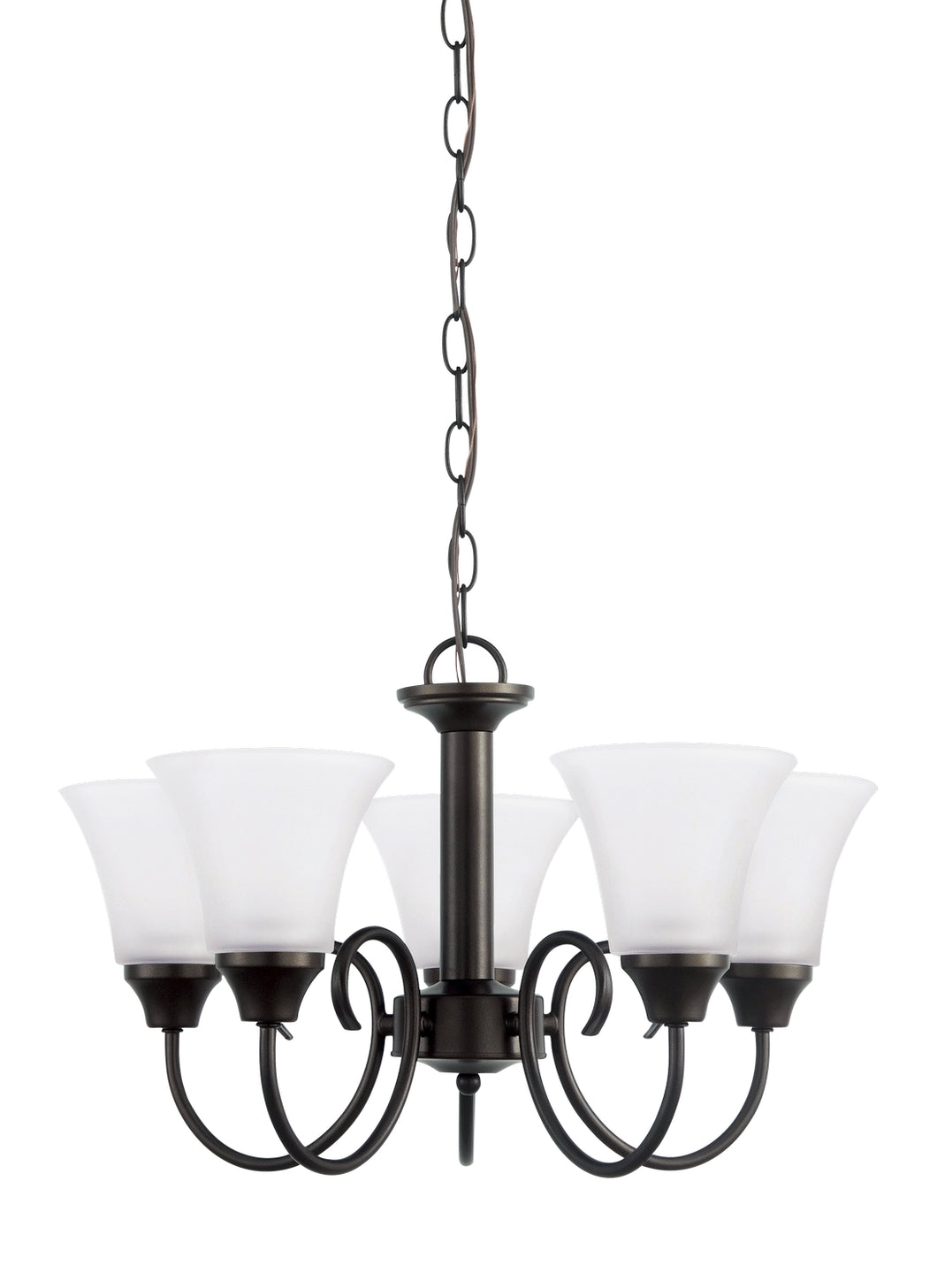 The Manufacturer Collection five light single tier chandelier in heirloom bronze supplies ample lighting for your daily needs, while adding a layer of today`s style to your home`s decor. The Collection by Manufacturer brings versatility and style to those just starting out. With softly flared glass and curved arms, there is just enough detail to give the overall look a lift while keeping it simple enough for those on a budget. Several chandeliers and sconces can be installed with lighting shining up or down, allowing the fixture to be customized for the specific space and function. Offered in a Brushed Nickel finish or Heirloom Bronze finish, both with Satin Etched glass. The assortment includes nine-light, five-light and three-light chandeliers, pendants in five sizes, both flush and semi-flush ceiling fixtures, as well as one-light, two-light three-light and four-light wall/bath fixtures. Both incandescent lamping and ENERGY STAR-qualified LED lamping are available. All fixtures are California Title 24 compliant.