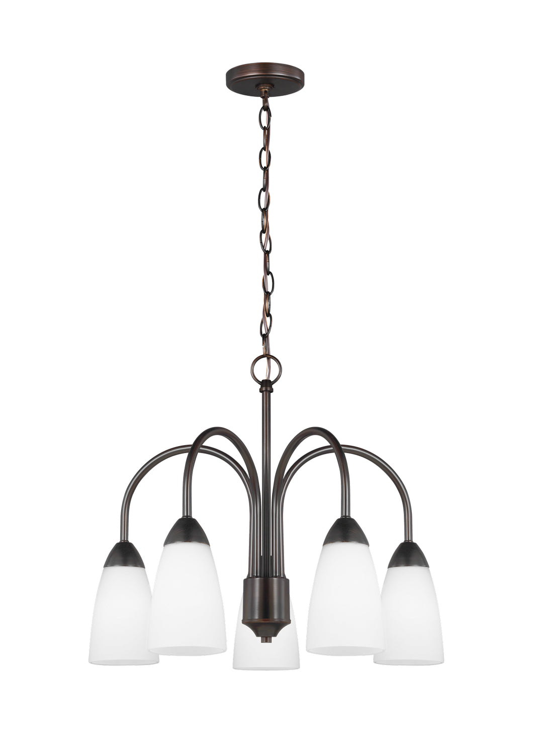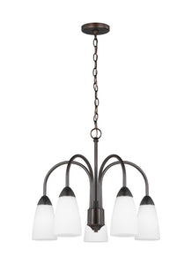 The Sea Gull Collection Seville five light single tier chandelier in burnt sienna enhances the beauty of your home with ample light and style to match today`s trends. The Seville collection represents commitment to high style at a sharp price. The modernist design is epitomized by the teardrop curves in the arms tipped by Etched glass diffusors throughout the chandeliers and bath fixtures. The collection offers a ``whole home`` lighting solution in every imaginable category. The assortment includes nine-light, five-light, and three-light chandeliers (either with up-light or down-light), pendants in four sizes as well as one-light, two-light, three-light , four-light and five-light wall/bath fixtures. Install a stylish and elegant addition to any room in the house. Seville is offered in Brushed Nickel and Burnt Sienna finishes.