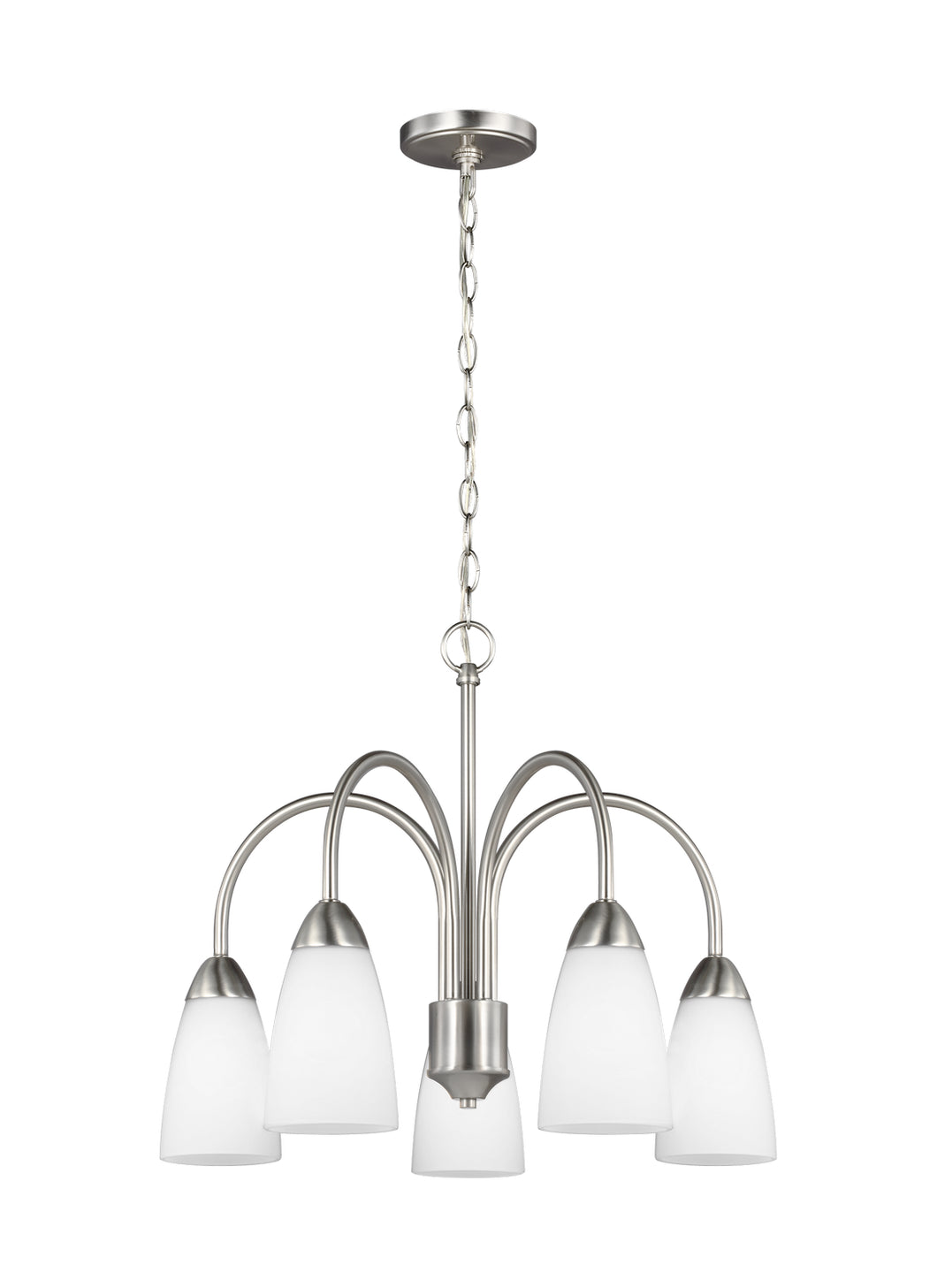 The Sea Gull Collection Seville five light single tier chandelier in brushed nickel provides abundant light to your home, while adding style and interest. The Seville collection represents commitment to high style at a sharp price. The modernist design is epitomized by the teardrop curves in the arms tipped by Etched glass diffusors throughout the chandeliers and bath fixtures. The collection offers a ``whole home`` lighting solution in every imaginable category. The assortment includes nine-light, five-light, and three-light chandeliers (either with up-light or down-light), pendants in four sizes as well as one-light, two-light, three-light , four-light and five-light wall/bath fixtures. Install a stylish and elegant addition to any room in the house. Seville is offered in Brushed Nickel and Burnt Sienna finishes.