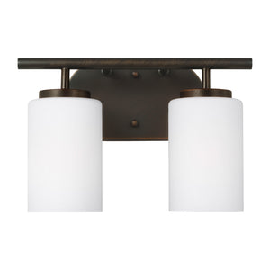 The Sea Gull Collection Oslo two light vanity fixture in burnt sienna provides abundant light for your bath vanity, while adding a layer of today`s style to your interior design. The Oslo lighting collection by Sea Gull Collection is a sleek design, with smooth and clean lines. The Opal Etched glass adds to this collection`s contemporary and minimalist character. Offered in Chrome, Brushed Nickel, Burnt Sienna and textured Blacksmith finishes, the collection includes nine-, five-, and three-light chandeliers, pendants in four sizes, both flush and semi-flush ceiling fixtures, as well as one-, two-, three- and four-light wall/bath fixtures. Both incandescent lamping and ENERGY STAR-qualified LED lamping are available. All fixtures are California Title 24 compliant.