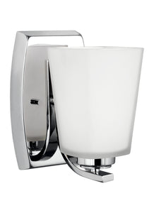 The Manufacturer Collection one light wall sconce in chrome offers shadow-free lighting in your powder room, spa, or master bath room. The Collection gives subtle nods to the craftsman movement while still making its own modernist statement. The subtly radiuses square and rectangle details translate across myriad design styles. Collection offers a versatile choice of finishes in Burnt Sienna and Chrome. Etched glass shades artfully illuminate any bath space. Available in a variety of installations from single to multiple bulbs to suit the setting and define the mood. Options abound to redefine a bath setting with a transitional style that is simultaneously classic and contemporary. All fixtures are ENERGY STAR?�-qualified and California Title 24 compliant.