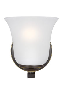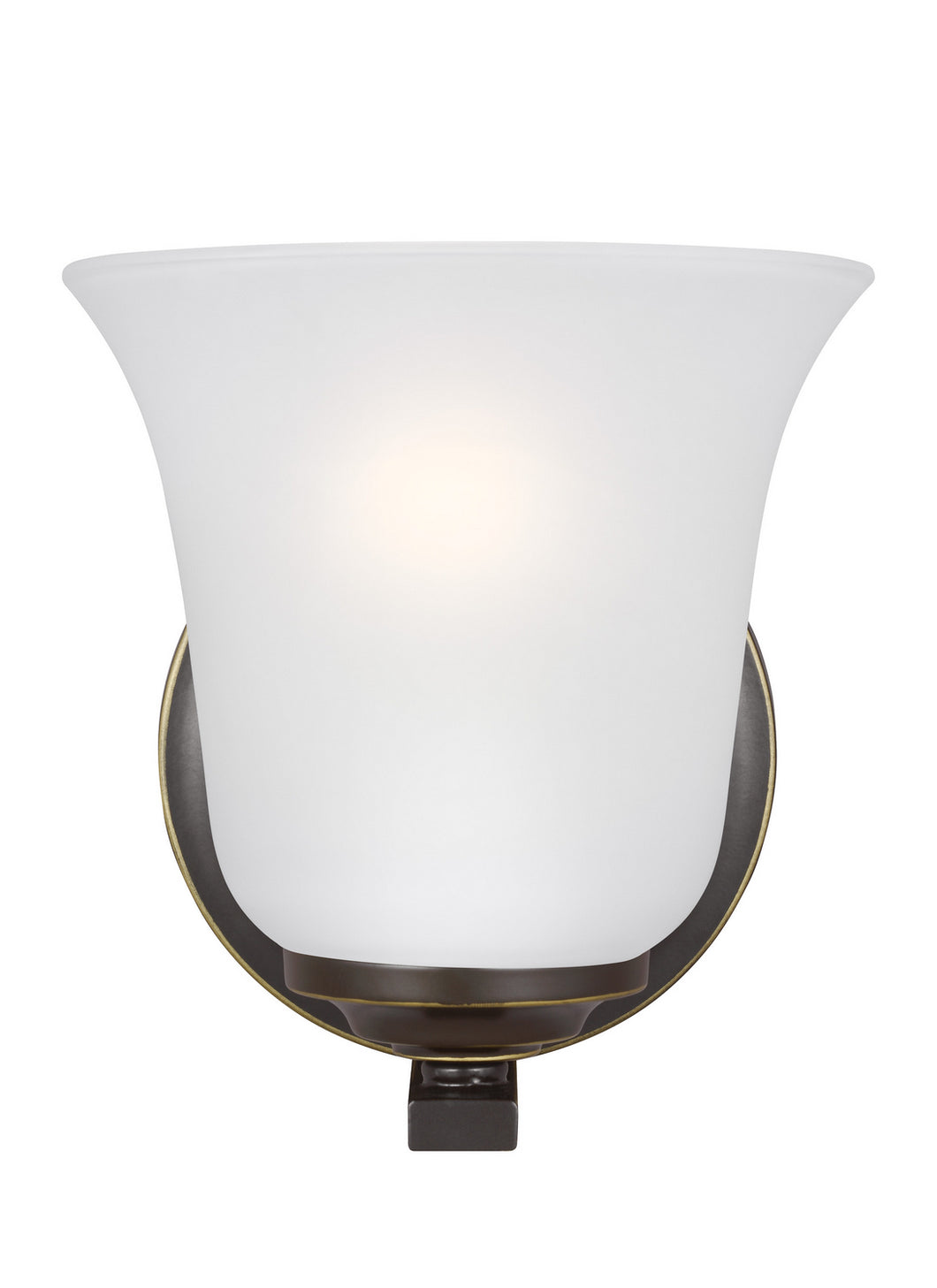 The Manufacturer Collection one light wall sconce in heirloom bronze is an ENERGY STAR� qualified lighting fixture that uses fluorescent bulbs to save you both time and money. The Collection lighting collection by Manufacturer combines form and function in a traditional empire silhouette. Trumpeted Satin Etched glass shades and a circular finial further enhance the design. Cluster three sizes together in a multi-fixture installation to make a beautifully dramatic statement in the living room, foyer, entryway or family room. The Collection comes in two finishes: Brushed Nickel and Heirloom Bronze. Its assortment includes three-, five- and nine-light chandeliers, one-light mini pendant, three-light pendant, two-light semi-flush mount, one-light wall sconce, and two-, three- and four- light bath vanity fixtures. Incandescent and ENERGY STAR-qualified LED lamping are available, all fixtures are California Title 24 compliant.