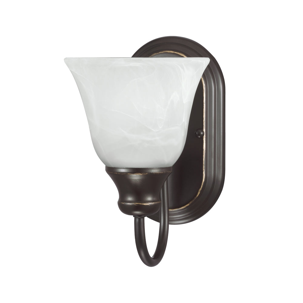 The Manufacturer Collection one light wall sconce in heirloom bronze offers shadow-free lighting in your powder room, spa, or master bath room. The Collection lighting collection by Manufacturer is a sensibly, modernized and transitional selection of fixtures featuring clean lines and sophisticated Alabaster style glass. The collection works well with a variety of interiors, as it blends well into its surrounding decor. Offered in Brushed Nickel or Heirloom Bronze finishes, as well as a Chrome finish for the wall/bath fixtures only. The assortment includes five-light, and three-light chandeliers (either with up-light or down-light), pendants in four sizes, both flush and semi-flush ceiling fixtures, as well as one-light, two-light, three-light and four-light wall/bath fixtures. Both incandescent lamping and ENERGY STAR-qualified LED lamping are available. Most of these fixtures easily convert to LED by purchasing LED replacement lamps sold separately.