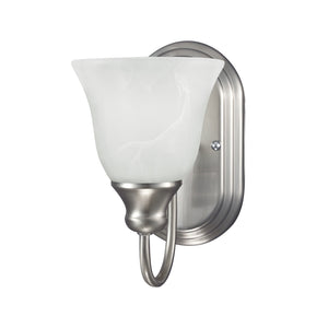 The Sea Gull Collection Windgate one light wall sconce in brushed nickel provides abundant light for your bath vanity, while adding a layer of today`s style to your interior design. The Windgate lighting collection by Sea Gull Collection is a sensibly, modernized and transitional selection of fixtures featuring clean lines and sophisticated Alabaster style glass. The collection works well with a variety of interiors, as it blends well into its surrounding decor. Offered in Brushed Nickel or Heirloom Bronze finishes, as well as a Chrome finish for the wall/bath fixtures only. The assortment includes five-light, and three-light chandeliers (either with up-light or down-light), pendants in four sizes, both flush and semi-flush ceiling fixtures, as well as one-light, two-light, three-light and four-light wall/bath fixtures. Both incandescent lamping and ENERGY STAR-qualified LED lamping are available. Most of these fixtures easily convert to LED by purchasing LED replacement lamps sold separately.