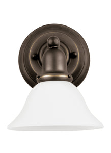 The Manufacturer Collection one light wall sconce in heirloom bronze is an ENERGY STAR� qualified lighting fixture that uses fluorescent bulbs to save you both time and money. The Collection lighting collection from Manufacturer is a perfect crossover from cottage style into urban chic. The Collection`s retro appeal softens and warms-up contemporary spaces, while retaining an up-to-date decor. Look to Collection when balance and unity are required in your interior design. Offered in Brushed Nickel finish with Satin White glass or Heirloom Bronze with Satin Etched glass. For the wall/bath fixtures only, a Chrome finish coupled with Satin White glass is also available. The assortment includes nine-light, five-light and three-light chandeliers, pendants in six sizes, both flush and semi-flush ceiling fixtures, as well as one-light, two-light, three-light and four-light wall/bath fixtures. Both incandescent lamping and ENERGY STAR-qualified LED lamping are available. Most of these fixtures easily convert to LED by purchasing LED replacement lamps sold separately.
