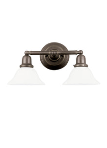 The Sea Gull Collection Sussex two-light vanity fixture in the heirloom bronze finish is a perfect crossover from cottage style into urban chic. The retro appeal of this task light softens and warms-up contemporary spaces, while retaining a period-style decor. White Satin Etched bell-shaped glass shades provide an inviting illumination above the mirror in your bathroom or hallway. If you are starting to convert to a more sustainable lifestyle, this ENERGY STAR® qualified lighting fixture uses LED bulbs to save you both time and money. The Sea Gull Collection by Generation Lighting has been an industry leader since 1919. Sea Gull`s promise is simple – to create beautiful lighting at an affordable value. From space, to function, to style and energy efficiency, Sea Gull offers complete solutions.