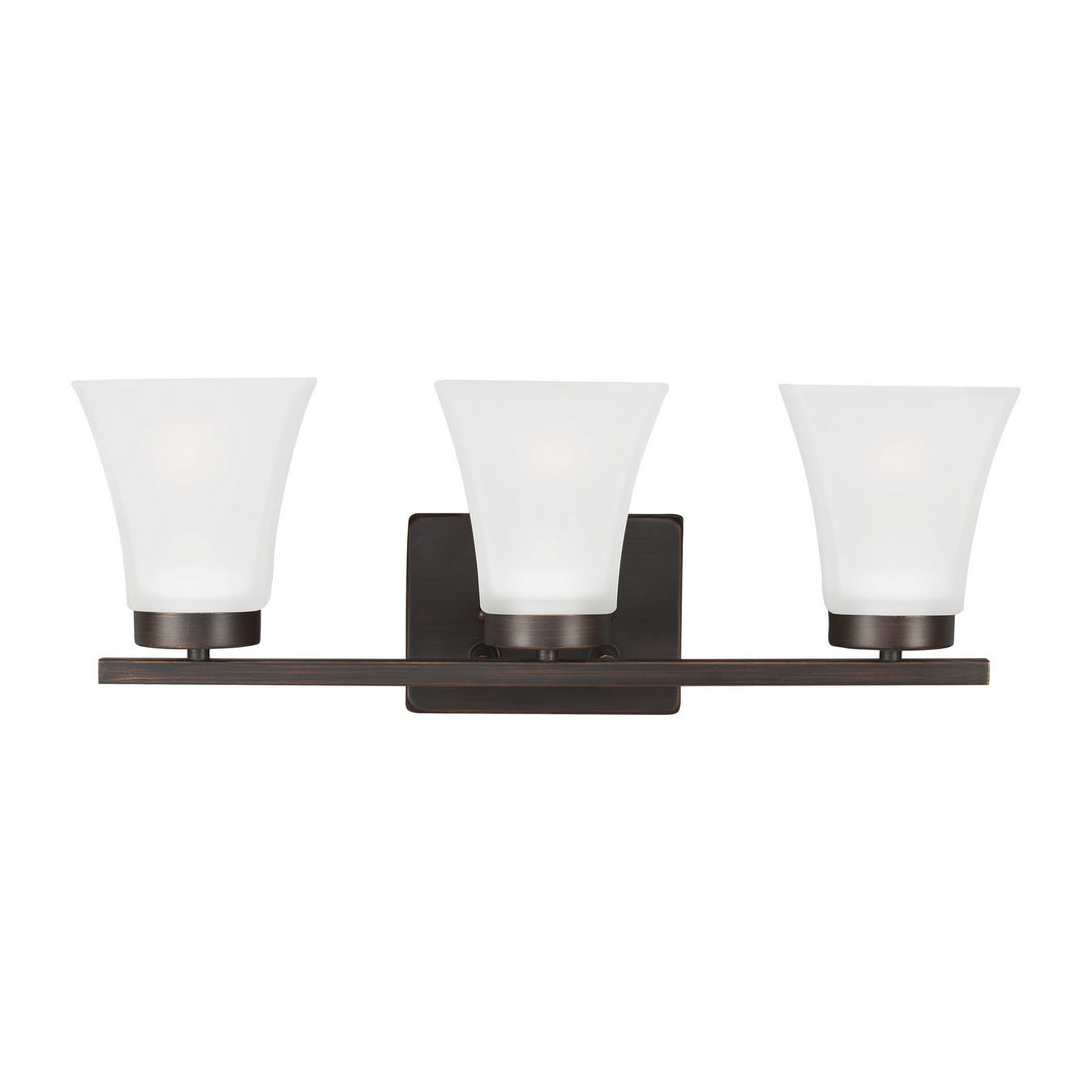 The Sea Gull Collection Bayfield three-light traditional vanity fixture is offered in a chrome, brushed nickel or burnt sienna finish and brings simplicity with a little flair to your space. The transitional design of this task light fixture is a subtle combination of clean lines and flared, angular Satin Etched glass and a rectangular back plate with smooth, rounded edges for a sleek, flush look. Topping a clean-lined horizontal rod are three frosted white glass bell -shaped shades. The Sea Gull Collection by Generation Lighting has been an industry leader since 1919. Sea Gull`s promise is simple – to create beautiful lighting at an affordable value. From space, to function, to style and energy efficiency, Sea Gull offers complete solutions.