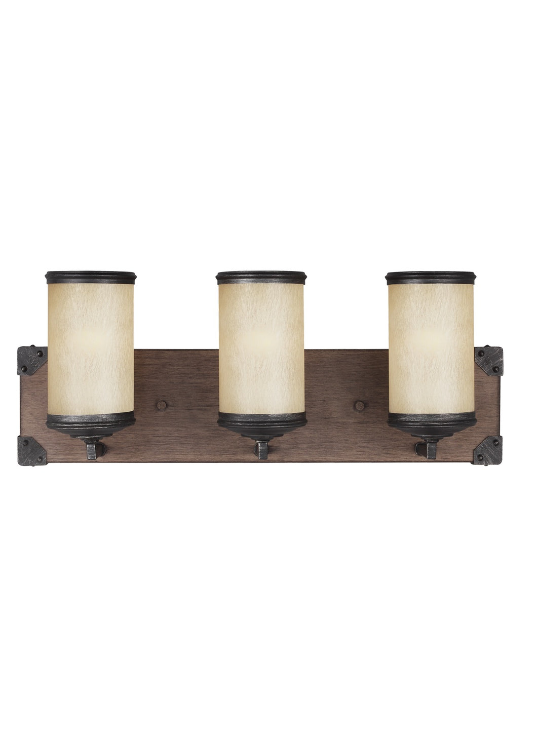 The Sea Gull Collection Dunning three light vanity fixture in stardust offers shadow-free lighting in your powder room, spa, or master bath room. Making a statement without overpowering the surrounding decor, the Dunning lighting collection by Sea Gull Collection is a chic addition to a wide range of interiors. The bold design is inspired by farmhouse influences seen in the rustic rope detail highlighting the open, square frame which surrounds medium based lamps covered in cream Parchment glass shades. The Dunning collection features a unique two-tone finish of Stardust on the overall metal structure, with the open frame in Cerused Oak finish. The full lighting collection features a three-light and five-light chandeliers, a one-light mini-pendant, a four-light island chandelier, a two-light flush mount, and one-light, two-light, three-light and four-light bath fixtures (all of which can mount up or down). Both incandescent lamping and ENERGY STAR-qualified LED lamping are available.