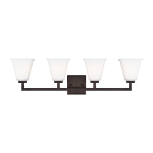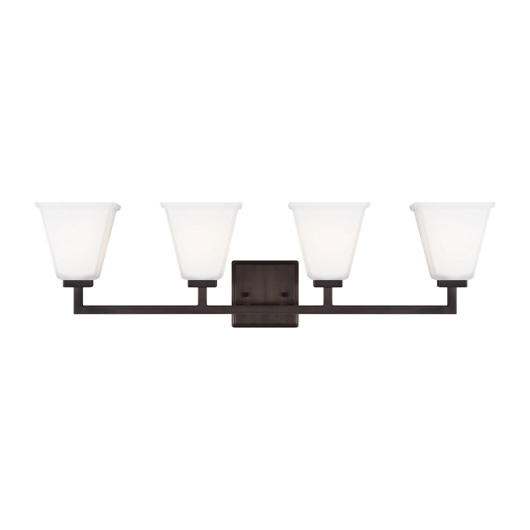 The Sea Gull Collection Ellis Harper four light vanity fixture in brushed oil rubbed bronze provides abundant light for your bath vanity, while adding a layer of today`s style to your interior design. Ellis Harper has an Arts and Crafts pedigree with a Modernist twist. The array of fixtures showcases Sea Gull`s commitment to high style with robust construction and craftsmanship at an exceptional price. The subtle detail allows this transitional design to easily fit into any decor. The sleek, geometric arms and square Satin Etched glass shades add touches of elegance to its streamlined profile. The assortment includes: four- and eight-light chandeliers, a six-light linear, one-light mini-pendant, and one-, two-, three- and four-light bath fixtures. All fixtures are offered in either a Brushed Nickel or Brushed Oil Rubbed Bronze.