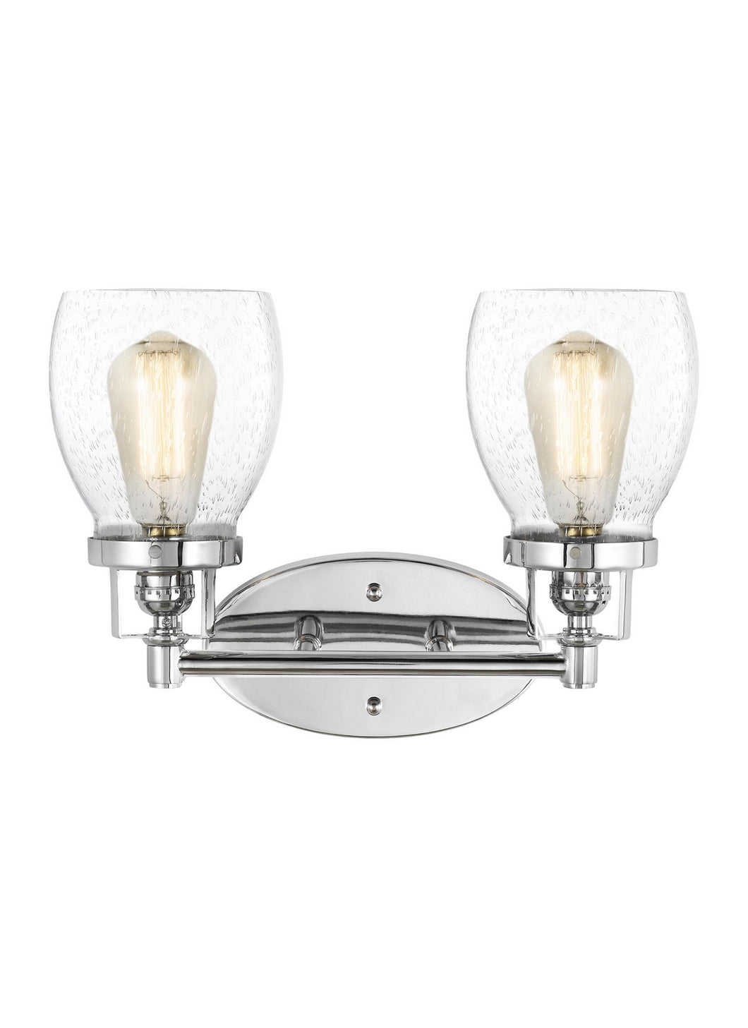 The Sea Gull Collection Belton two light vanity fixture in chrome provides abundant light for your bath vanity, while adding a layer of today`s style to your interior design. Influenced by the vintage industrial designs of early 20th Century America, the transitional Belton lighting collection by Sea Gull Collection has Seeded glass shades that highlight the classic Edison bulbs. The rich Heirloom Bronze and Brushed Nickel finishes adds to the layer of retro design to the warm look. The assortment includes three- and five- down light chandeliers, five-light upright chandelier, a four-light island pendant, one-light pendant, one-light mini pendant, and one-, two-, three- and four-light bath fixtures. All fixtures are California Title 24 compliant and easily convert to LED by purchasing LED lamps sold separately.
