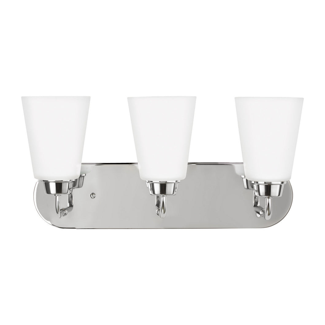 The Sea Gull Collection Kerrville three light vanity fixture in chrome offers shadow-free lighting in your powder room, spa, or master bath room. With a simple, airy appearance, the Kerrville lighting collection by Sea Gull Collection embraces its modern design roots while enhancing virtually any homes decor. Tubular steel arms extend outward and curve to present beautiful tapered, Satin Etched glass shades. The collection has a Brushed Nickel, Burnt Sienna or Chrome finish and offers three-, five- and nine-light chandeliers, a one-light mini pendant, one- and three-light pendants, a two-light semi-flush mount which can convert to a pendant, and one-, two-, three- and four-light bath fixtures. Incandescent and ENERGY STAR-qualified LED lamping are available, all fixtures are California Title 24 compliant.