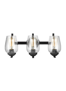 The Sea Gull Collection Morill three-light industrial vanity fixture in the blacksmith finish combines retro trends to make an impactful lighting design statement. The dark, textured finish of this task light fixture contrasts dramatically with the goblet-shaped, Clear seeded glass shades which are especially dramatic when used with antique style Edison light bulbs. The Sea Gull Collection by Generation Lighting has been an industry leader since 1919. Sea Gull`s promise is simple – to create beautiful lighting at an affordable value. From space, to function, to style and energy efficiency, Sea Gull offers complete solutions.