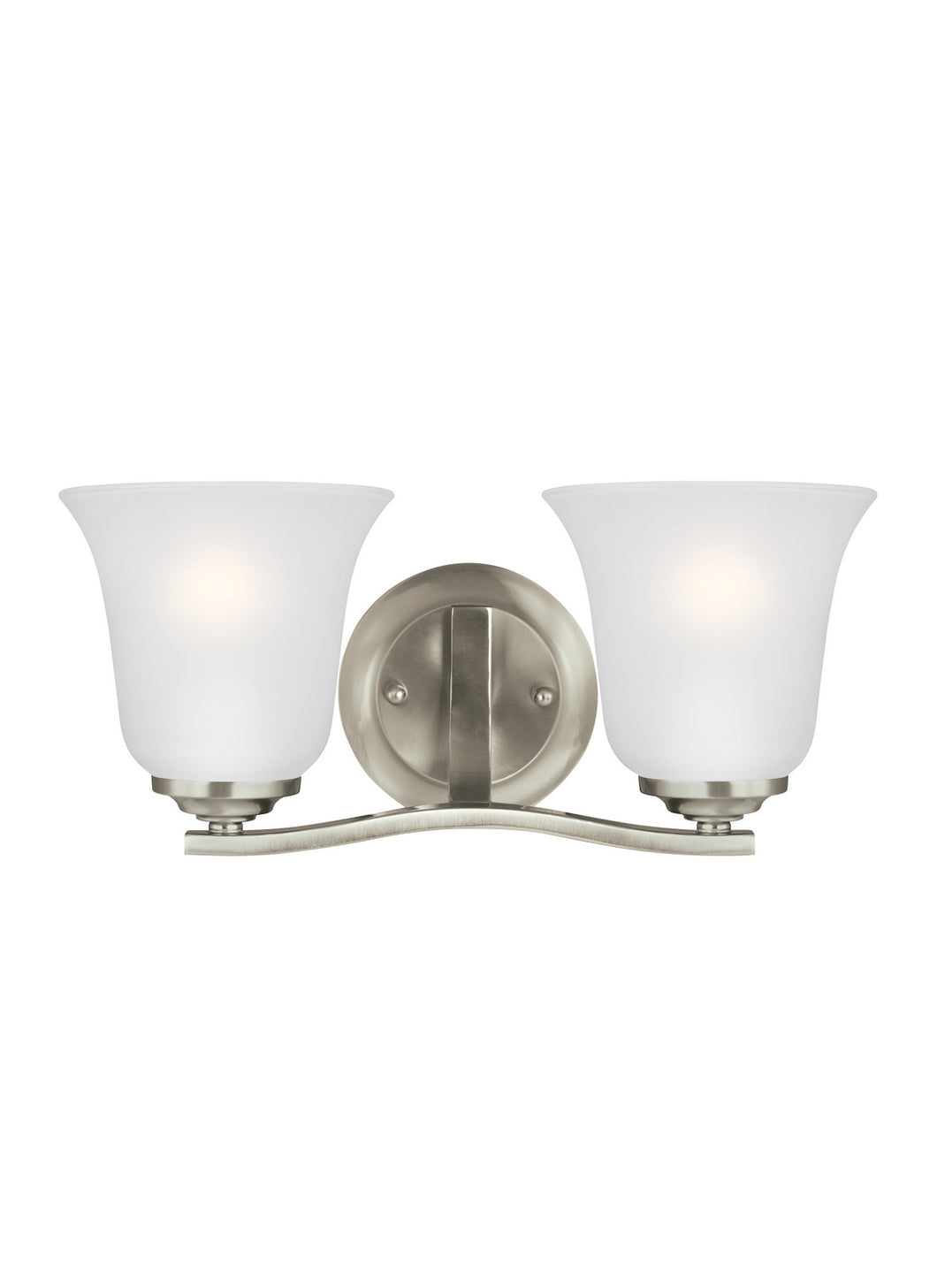 The Sea Gull Collection Emmons two light vanity fixture in brushed nickel provides abundant light for your bath vanity, while adding a layer of today`s style to your interior design. The Emmons lighting collection by Sea Gull Collection combines form and function in a traditional empire silhouette. Trumpeted Satin Etched glass shades and a circular finial further enhance the design. Cluster three sizes together in a multi-fixture installation to make a beautifully dramatic statement in the living room, foyer, entryway or family room. The Emmons collection comes in two finishes: Brushed Nickel and Heirloom Bronze. Its assortment includes three-, five- and nine-light chandeliers, one-light mini pendant, three-light pendant, two-light semi-flush mount, one-light wall sconce, and two-, three- and four- light bath vanity fixtures. Incandescent and ENERGY STAR-qualified LED lamping are available, all fixtures are California Title 24 compliant.