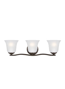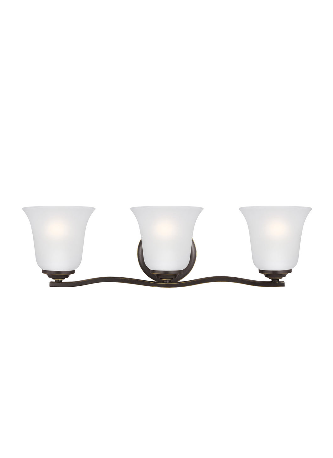 The Manufacturer Collection three light vanity fixture in heirloom bronze offers shadow-free lighting in your powder room, spa, or master bath room. The Collection lighting collection by Manufacturer combines form and function in a traditional empire silhouette. Trumpeted Satin Etched glass shades and a circular finial further enhance the design. Cluster three sizes together in a multi-fixture installation to make a beautifully dramatic statement in the living room, foyer, entryway or family room. The Collection comes in two finishes: Brushed Nickel and Heirloom Bronze. Its assortment includes three-, five- and nine-light chandeliers, one-light mini pendant, three-light pendant, two-light semi-flush mount, one-light wall sconce, and two-, three- and four- light bath vanity fixtures. Incandescent and ENERGY STAR-qualified LED lamping are available, all fixtures are California Title 24 compliant.