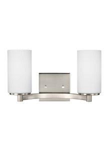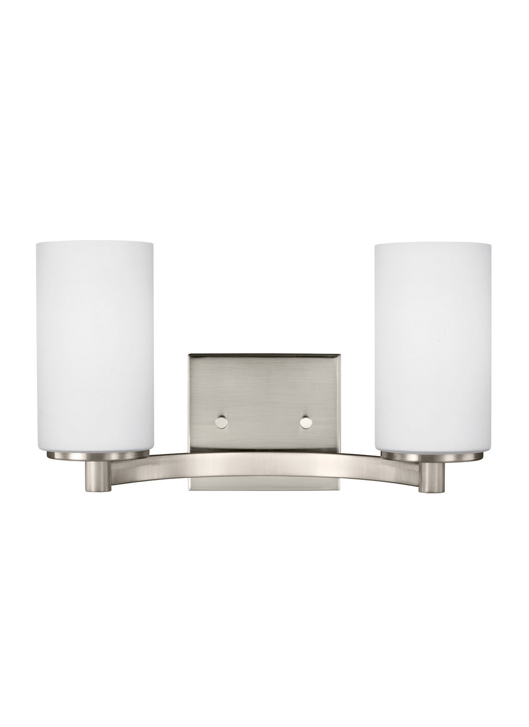 The Sea Gull Collection Hettinger two-light chic and modern vanity fixture offered in a chrome, brushed nickel or burnt sienna finish will help make your bathroom your own private sanctuary and give just the right amount of light for all your daily tasks. The minimalism of the tubular glass shades balances with the unique, outward-curve of the semi-circular arm detail. If you are starting to convert to a more sustainable lifestyle, this ENERGY STAR® qualified lighting fixture uses LED bulbs to save you both time and money. The Sea Gull Collection by Generation Lighting has been an industry leader since 1919. Sea Gull`s promise is simple – to create beautiful lighting at an affordable value. From space, to function, to style and energy efficiency, Sea Gull offers complete solutions.