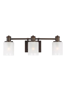 The Sea Gull Collection Norwood three light vanity fixture in burnt sienna offers shadow-free lighting in your powder room, spa, or master bath room. The Norwood family from Sea Gull Collection draws on the modernist traditions of ``less is more``. Essential functional elements dictate the aesthetics, and clean lines prevail. Layers of intricately finished hand-brushed steel progress vertically to the soft glow of light diffused through finely etched glass diffusors.