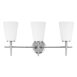 The Sea Gull Collection Driscoll three-light traditional vanity fixture offered in a chrome, Satin bronze or brushed nickel finish gives your space a blend of mid-century lighting style with its cool, reflective surface. This understated task light fixture features a round back plate and two conical arms, while a slightly tapered cased opal glass drum shade highlights your bathroom or hallway with elegance and modern charm. The Sea Gull Collection by Generation Lighting has been an industry leader since 1919. Sea Gull`s promise is simple – to create beautiful lighting at an affordable value. From space, to function, to style and energy efficiency, Sea Gull offers complete solutions.