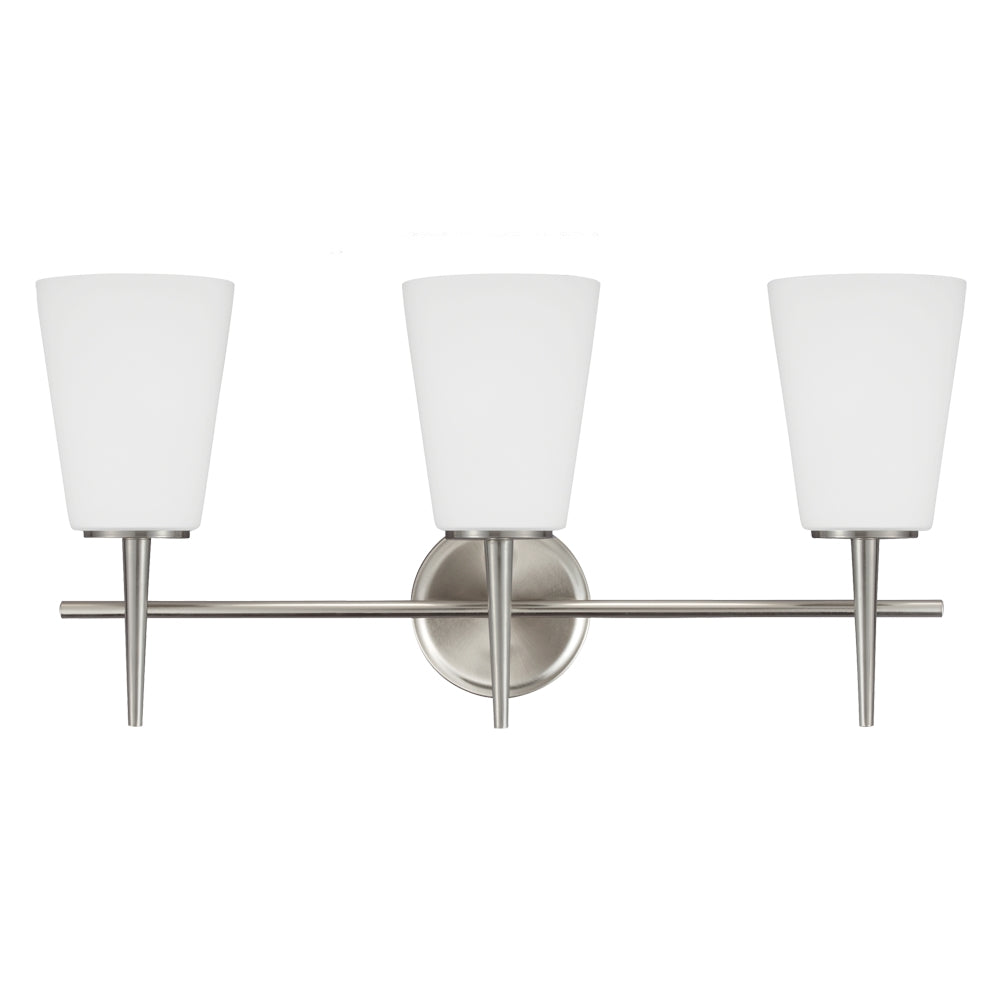 The Sea Gull Collection Driscoll three-light traditional vanity fixture offered in a chrome, Satin bronze or brushed nickel finish gives your space a blend of mid-century lighting style with its chic silhouette. This understated task light fixture features a round back plate and two conical arms, while a slightly tapered cased opal glass drum shade highlights your bathroom or hallway with elegance and modern charm. The Sea Gull Collection by Generation Lighting has been an industry leader since 1919. Sea Gull`s promise is simple – to create beautiful lighting at an affordable value. From space, to function, to style and energy efficiency, Sea Gull offers complete solutions.