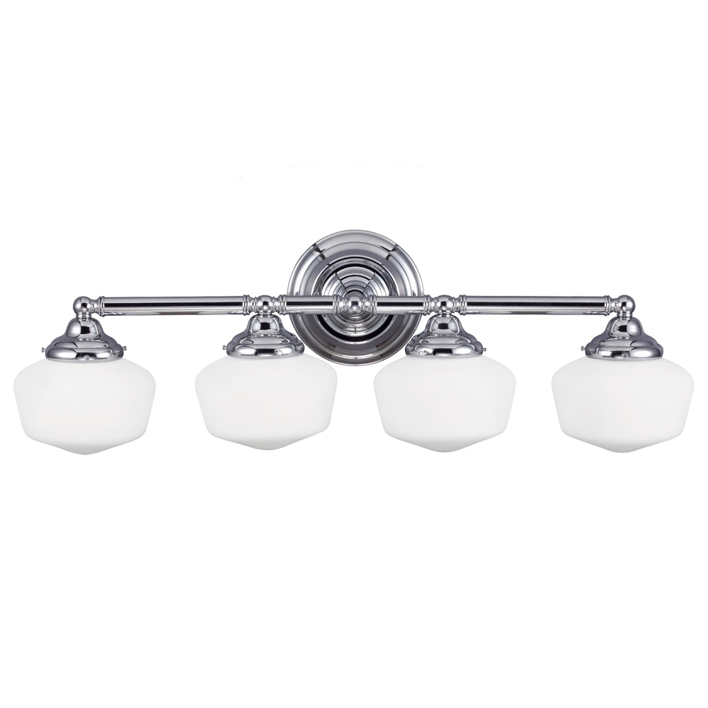 The Sea Gull Collection Academy four-light traditional vanity fixture offered in a chrome, heirloom bronze or brushed nickel finish gives an updated appeal to this classic silhouette. Use this versatile piece in a bathroom, hallway or powder room for a clean look. This task light fixture provides a circular wall mount with a steel frame and frosted glass shades to present your space with upscale illumination. The Sea Gull Collection by Generation Lighting has been an industry leader since 1919. Sea Gull`s promise is simple – to create beautiful lighting at an affordable value. From space, to function, to style and energy efficiency, Sea Gull offers complete solutions.