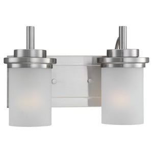 The Manufacturer Collection two light vanity fixture in brushed nickel offers shadow-free lighting in your powder room, spa, or master bath room. The Collection indoor lighting collection by Manufacturer has a clean design which lends itself to a modern-mission style. The geometric, cylinder design has subtle ornamentation, while still offering impressive style. The indoor lighting collection is offered in Brushed Nickel or textured Blacksmith finishes, both with Satin Etched glass. The assortment includes 15-light, nine-light, five-light, and three-light chandeliers, pendants in four sizes, both flush and semi-flush ceiling fixtures, as well as one-light, two-light, three-light and four-light wall/bath fixtures. Most of these fixtures easily convert to LED by purchasing LED replacement lamps sold separately.