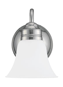 The Sea Gull Collection Gladstone one-light traditional wall sconce offered in a chrome, antique brushed nickel or heirloom bronze finish brings a comforting aesthetic to your space. This task light fixture is an example of less is more, with the design of understated curves and white Satin Etched bell shaped glass. If you are starting to convert to a more sustainable lifestyle, this ENERGY STAR® qualified lighting fixture uses LED bulbs to save you both time and money. The Sea Gull Collection by Generation Lighting has been an industry leader since 1919. Sea Gull`s promise is simple – to create beautiful lighting at an affordable value. From space, to function, to style and energy efficiency, Sea Gull offers complete solutions.