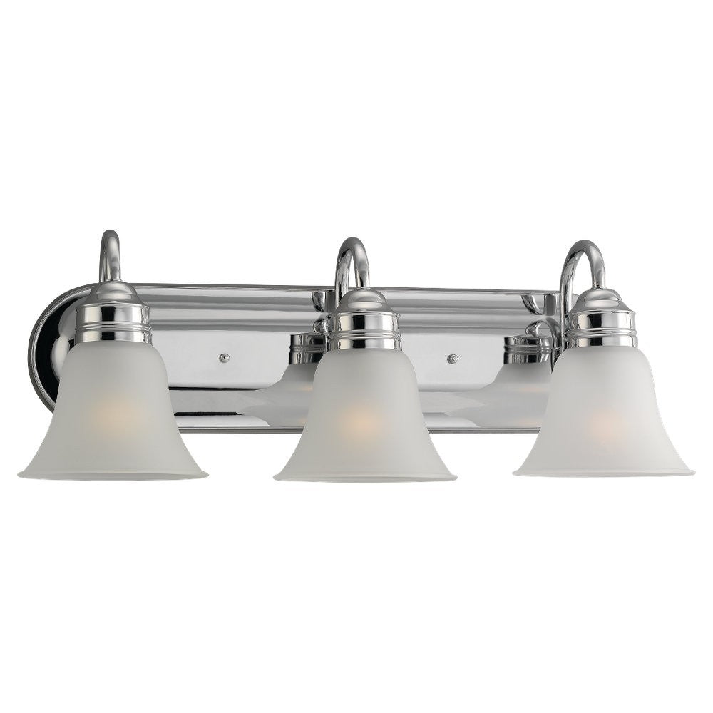 The Sea Gull Collection Gladstone three light vanity fixture in chrome provides abundant light for your bath vanity, while adding a layer of today`s style to your interior design. Moving beyond traditional styling, the Gladstone bath collection by Sea Gull Collection is all about today`s transitional, comfortable lifestyles. A perfect example of less is more and controlled design allows the understated curves and bell shaped glass to be the statement. Offered in Antique Brushed Nickel and Chrome finishes with Satin Etched glass, and Heirloom Bronze finish with Smoky Amber Glass. The assortment includes one-light, two-light, three-light, four-light, five-light and six-light wall/bath fixtures. Both incandescent lamping and ENERGY STAR-qualified LED lamping are available. All fixtures are California Title 24 compliant.