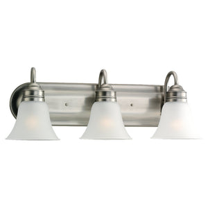 The Sea Gull Collection Gladstone three light vanity fixture in antique brushed nickel provides abundant light for your bath vanity, while adding a layer of today`s style to your interior design. Moving beyond traditional styling, the Gladstone bath collection by Sea Gull Collection is all about today`s transitional, comfortable lifestyles. A perfect example of less is more and controlled design allows the understated curves and bell shaped glass to be the statement. Offered in Antique Brushed Nickel and Chrome finishes with Satin Etched glass, and Heirloom Bronze finish with Smoky Amber Glass. The assortment includes one-light, two-light, three-light, four-light, five-light and six-light wall/bath fixtures. Both incandescent lamping and ENERGY STAR-qualified LED lamping are available. All fixtures are California Title 24 compliant.