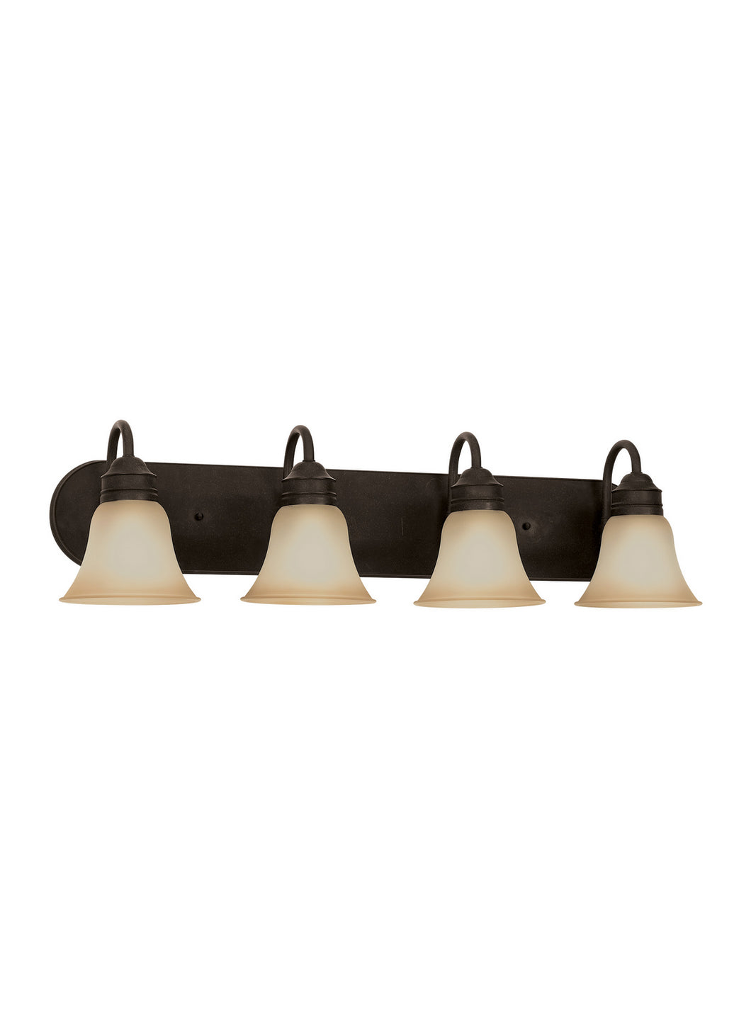 The Manufacturer Collection four light vanity fixture in heirloom bronze is an ENERGY STAR� qualified lighting fixture that uses fluorescent bulbs to save you both time and money. Moving beyond traditional styling, the Collection bath collection by Manufacturer is all about today`s transitional, comfortable lifestyles. A perfect example of less is more and controlled design allows the understated curves and bell shaped glass to be the statement. Offered in Antique Brushed Nickel and Chrome finishes with Satin Etched glass, and Heirloom Bronze finish with Smoky Amber Glass. The assortment includes one-light, two-light, three-light, four-light, five-light and six-light wall/bath fixtures. Both incandescent lamping and ENERGY STAR-qualified LED lamping are available. All fixtures are California Title 24 compliant.