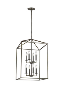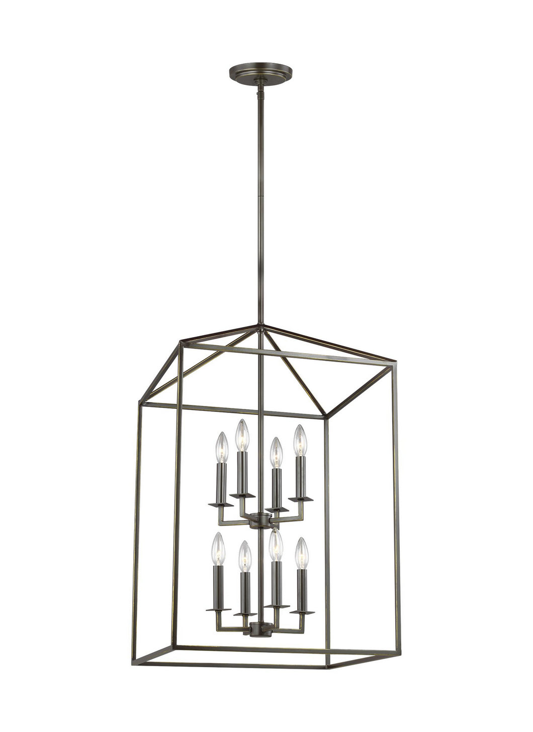 The Manufacturer Collection eight light indoor pendant in heirloom bronze is an ENERGY STAR� qualified lighting fixture that uses fluorescent bulbs to save you both time and money. The transitional Collection pendant light collection by Manufacturer is inspired by stately, carriage lanterns. The updated open frame is formed with sleek square steel tubing, and each pendant is a generously proportioned, minimalist silhouette completed in either textured Blacksmith or Heirloom Bronze finishes. Offered are small and large four-light hall/foyer pendants, an eight-light hall/foyer pendant and an eight-light island pendant. Incandescent candelabra base lamping. Damp rated, Collection is also ideal as a focal point on a covered patio or porch.