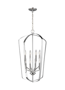 The Sea Gull Collection Romee eight light indoor pendant in chrome is a playful, yet simple spin on the classic lantern. With clean lines and elegant lamping holders makes Romee the perfect addition to any space without taking the spotlight from the decor, but will illuminate with superb class. The full Romee series is available in three beautiful finishes Brushed Nickel, Chrome and Heirloom Bronze with three and six light options, making it easy to add Romee to any decor.