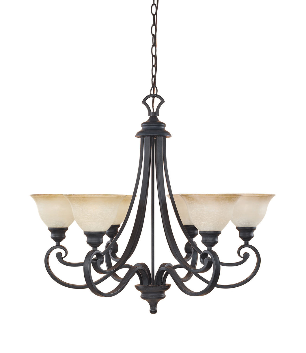 Featuring a natural iron finish over hand-forged ironwork with softly scrolled arms, the Monte Carlo 6-Light Natural Iron Chandelier from Designers Fountain gives new life to an Old World classic. Durable steel construction and ochere-finished glass shades ensure that this chandelier will provide warmly diffused illumination for years to come. Perfect for dining areas and foyers, the elegant fixture installs easily and comes with a 3 ft. decorative chain to adjust the hanging length for your particular space.