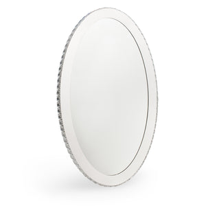 Finesse Decor brings you this Beautiful oval mirror encased by crystals and light. This mirror is perfect for any bathroom or make up table.